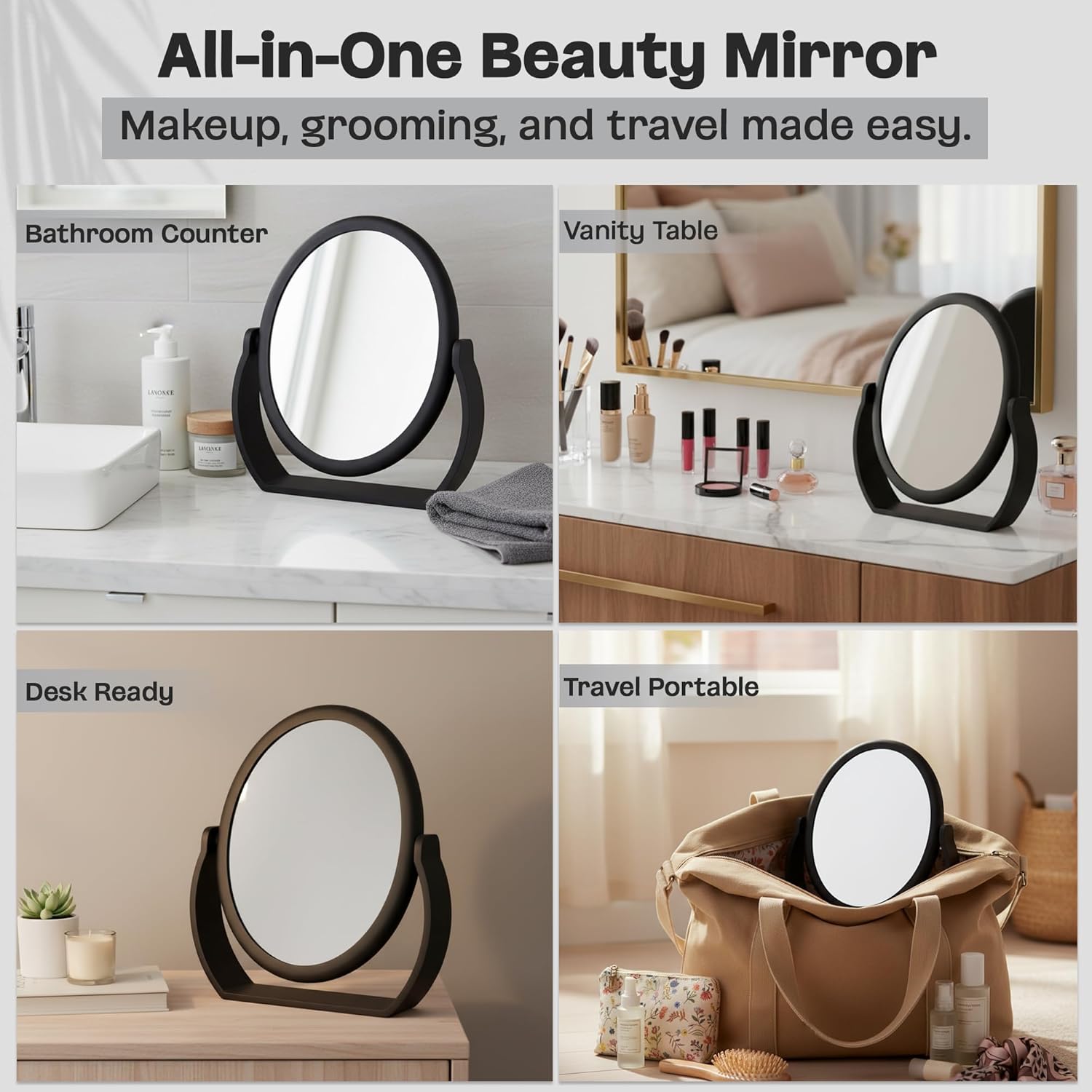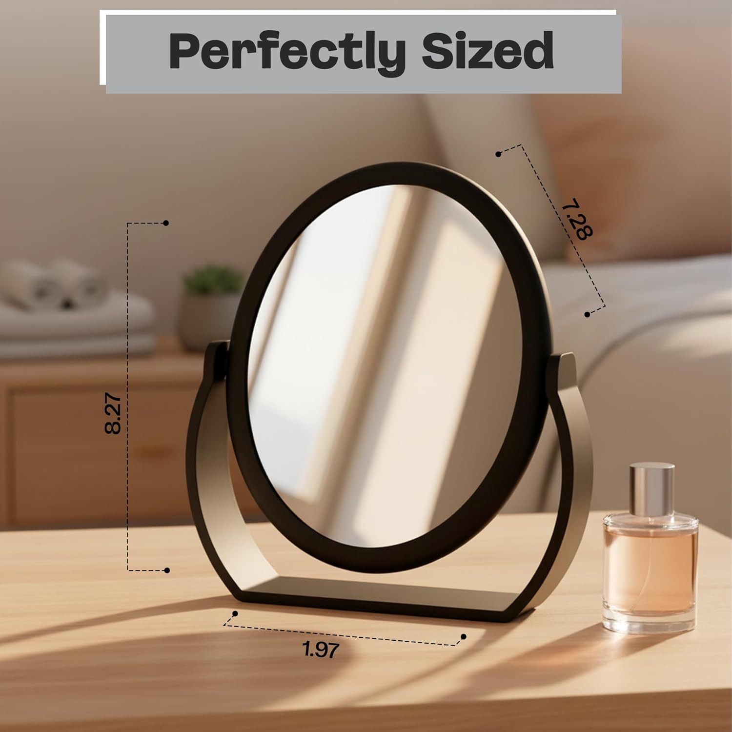 Elevate your daily beauty routine with the Danielle Creations Oval Soft Touch Vanity Mirror, a versatile and stylish solution designed for precision, comfort, and convenience. Finished in sleek black with a soft-touch coating, this mirror adds a modern accent to any bathroom vanity, bedroom mirror setup, or makeup desk while offering a secure, comfortable feel during use.This dual-sided mirror features 1x and 7x magnification, allowing you to switch effortlessly between a true-to-life reflection and detailed close-up viewing. Whether applying makeup, shaping brows, inserting contacts, or performing skincare routines, this magnifying makeup mirror provides clarity where you need it most. It functions perfectly as a makeup mirror with magnification, bathroom vanity mirror, or tabletop mirror for everyday grooming.Designed with portability in mind, the compact size makes it easy to use as a handheld mirror or portable mirror while still standing securely on flat surfaces thanks to its stable built-in stand. Measuring 7.28 inches long, 1.97 inches wide, and 8.27 inches high, it fits neatly on vanities, desks, or countertops without taking up excessive space. Ideal for those seeking a small mirror, mirror for desk, or mini mirror that delivers professional results.This multi-purpose mirror adapts to your lifestyle—use it as a bathroom mirror, vanity mirror, desk mirror, or hand mirror with handle for flexible beauty routines. Its durable construction ensures long-lasting performance, while the sleek oval shape complements a wide range of décor styles.Whether at home or on the go, the Danielle Creations Oval Soft Touch Vanity Mirror is a reliable beauty essential. Perfect for personal use or gifting, it combines functionality, elegance, and portability in one thoughtfully designed mirror.