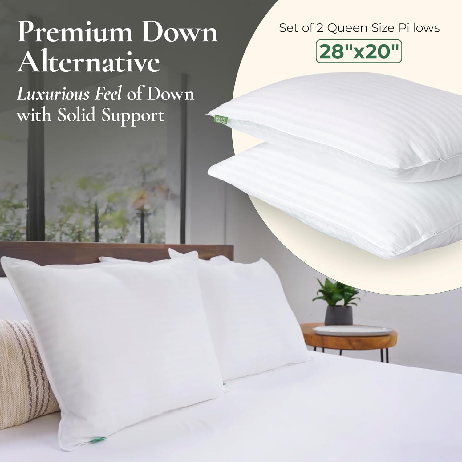 Experience Unmatched Comfort with Our Premium Down Alternative Pillows Sleep like you’re in a luxury hotel with our down alternative pillow—crafted for breathability, softness, and support. Featuring a 100% cotton cover and 100% poly gel fiber fill, this bed pillow mimics the lightness of goose down—without allergens, cruelty, or the hassle. The gel-infused microfiber filling makes these cooling pillows ideal for hot sleepers. With a zippered, adjustable fill, you can customize loft to your comfort—great for side sleepers, back sleepers, and stomach sleepers. Offered in pillows queen size set of 2, king size pillows set of 2, and pillows standard size set of 2, these luxury pillows are suited for every bed. Whether you’re upgrading to queen size pillows, trying a standard pillow, or seeking plush king size pillows, this set delivers. These fluffy pillows are ideal as hotel pillows, organic pillows, or your next favorite pillows for bed. Designed to match the feel of the best hotel quality pillows, they’re often called the best pillows for sleeping—plush, supportive, and breathable. Whether you're shopping for a pillow queen, a pillows set of 2, or looking for a top rated pillow, this down alternative design blends comfort, function, and value beautifully. Perfect as cooling pillows queen size set of 2 or extra soft pillows for sleeping, they offer the coziness of down pillows queen size set of 2, the feel of an organic pillow, and the practicality of being machine washable and hypoallergenic.