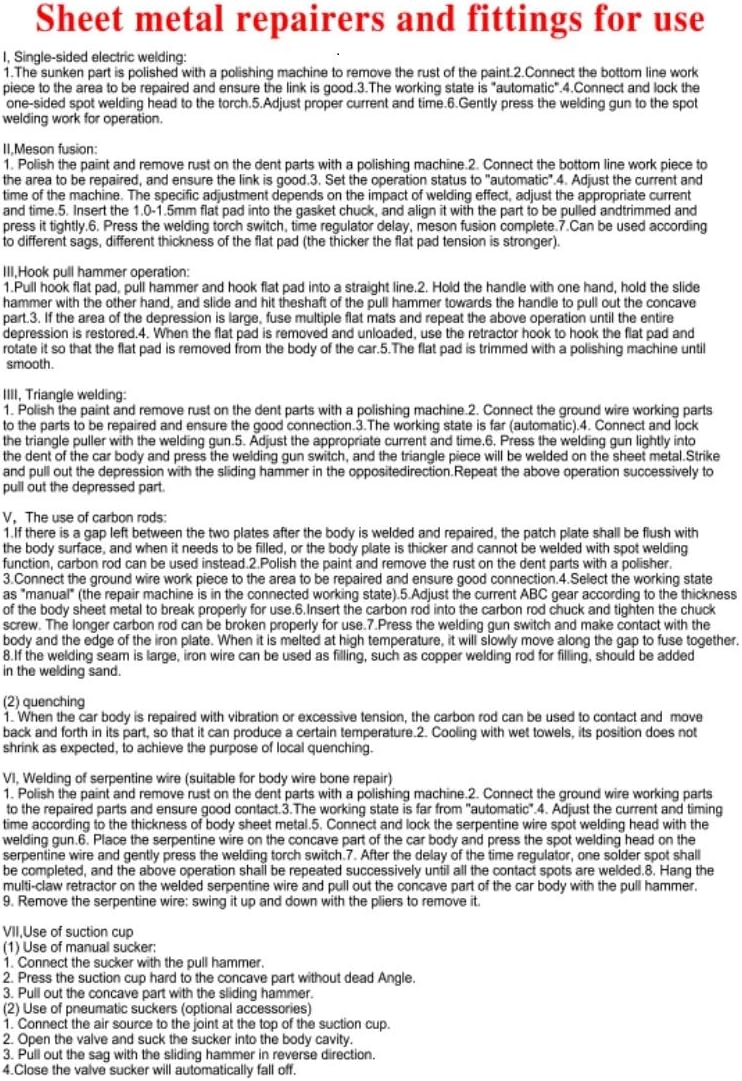 Description:This dent repair kit mainly made of stainless steel, brass, and copper-plated iron, with high hardness, high abrasion resistance, and long service life.The electrode carbon heating rod operates at 400 A. A simple touch is all that is required to automatically straighten the contact between the tool and the element.3 spare switches allow you to replace the switches in time when they are damaged without having to replace the entire spot welding gun.The 6-finger jaw hook has a strong grip, thus making dent repair easier.The compact size of the spot welding gun and stackable parts allow you to easily store them in small spaces.The anti-slip pattern on the handle effectively enhances friction, making it easier to grip.Complete accessories and simple structure allow you to quickly master the welder kit, even women can easily operate.This 86pcs stud welder dent puller kit allows you not to wait for car dent repair at the repair shop. It will enable you to do the repair at home, which can save you more time and money.It is a helpful body repair dent removal tool for any car dent. It can repair door dents, hail damage, and other dents, and is also highly effective for dents on refrigerators, washing machines, and other metal surfaces.This dent welder kit is suitable for the dent repair of any car. It can also be used as a general dent removal tool and hail dent removal tool for repairing dents on metal surfaces of automobiles, motorcycles, refrigerators, washing machines, etc.With this car dent repair tool, can repair all the dents on your car without damaging the body paint and without painting.Please note: this kit should be used in conjunction with an auto body dent repair equipment spot welding gun.Specifications:Number of Items: 86Color: Gold, Silver, BlackAssembly Required: YesMaterial:Recessed Pull Hammer: Stainless SteelSpot Welding Gun: ABS+CopperJaw Hook: Stainless SteelWasher Hook: Stainless SteelWasher Holder: BrassWelding Head: CopperSwing Wire: Copper-plated IronStraightening Drill Bit: Copper-plated IronDent Pull Star Pad: Copper-plated IronStar Pulling Pad Holder: BrassCarbon Rod Holder: BrassDimensions:Recessed Pull Hammer: 14.4'', 4 lbsScrew Head Size: M-16Spot Welding Gun: 8.3'' x 6.5'', 1.1 lbsJaw Hook: Screw Size: M-16Washer Hook: Length: 5.1''Screw Size: M-16Washer Holder: Length: 2.35''Welding Head: Length: 3''Diameter: 0.4''Swing Wire: Length: 13''Straightening Bit: Length: 2.3''Thickness: 0.06''-0.08''Hole Size: 0.67'' x 0.4''Dent Traction Star Pad: Thickness: 0.06''-0.08''Hole Size: 0.4''Tripod Holder: Length: 1.77''Screw Size: M-16Carbon Rod Holder: Length: 2.56''Hole Size: 0.4''Product Size: 21'' x 17'' x 8.5''Package Size: 16'' x 8'' x 5''Product Weight: 8 lbsShipping Weight: 9 lbsPackage Includes:1 x Recessed Pull Hammer 1 x Spot Welding Gun3 x Spot Welding Gun Switches1 x Jaw Hook with 6 Fingers1 x Dent Hook1 x Washer1 x Double-sided Spot Welding Head1 x Graphite Rod Bracket10 x Swing Wires50 x Dent Straightening Drill Bits10 x Dent Pull Star Mats1 x Star Pull Pad Bracket5 x Graphite Rods