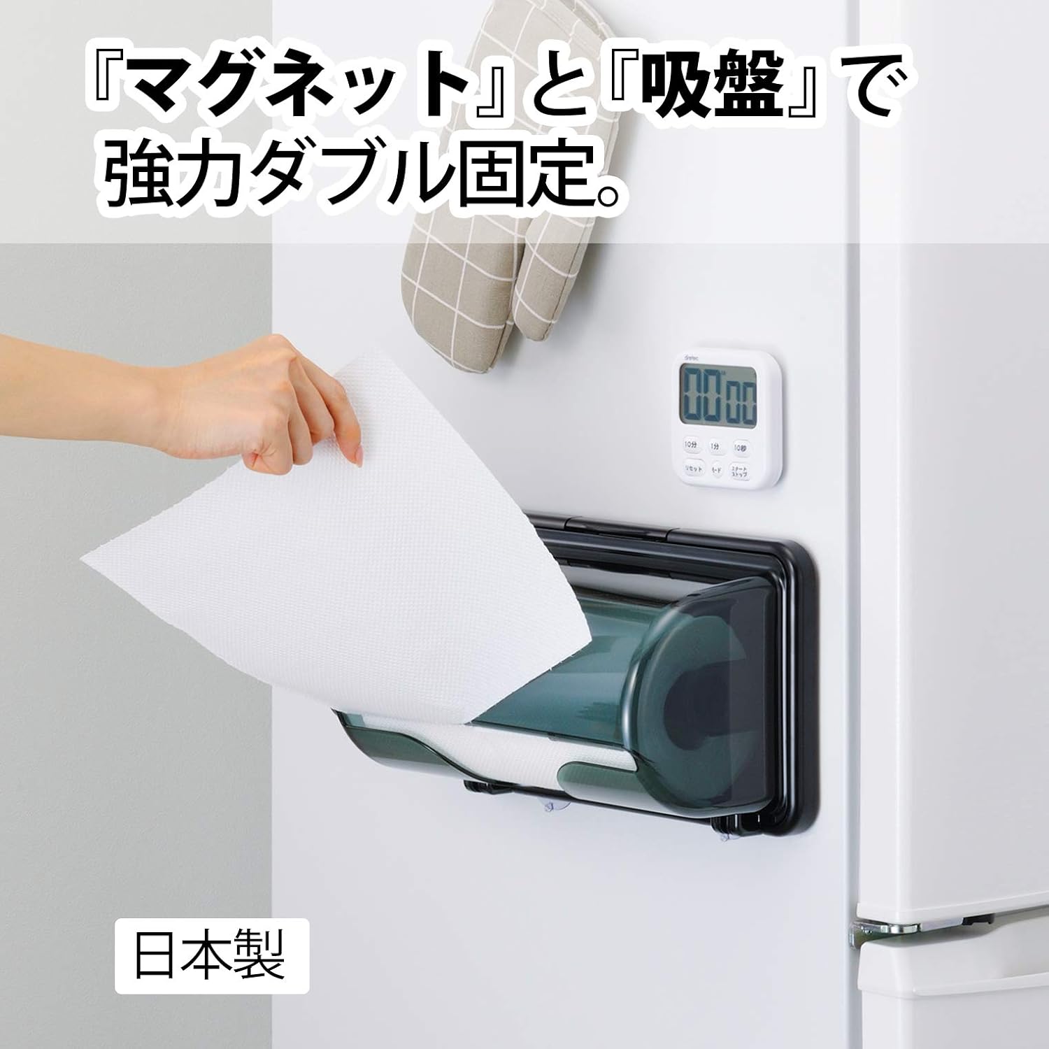 "Convenient" + "Clean" + "Smart" kitchen paper holder. Cleverly cut paper with one hand while cooking. The cover covers the top half of kitchen paper and protects against dust, water splashes, oil stains, etc. Strong double fixing with magnet and suction cups