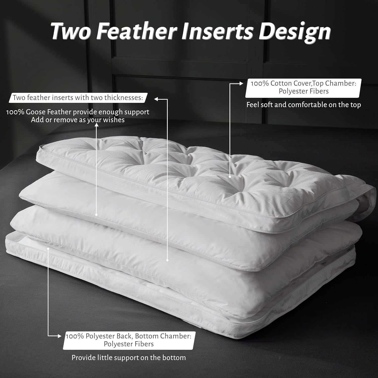 • [ADJUSTABLE BED PILLOW] You will receive an assemblable Feather Pillow with Zipper Closure Pillowcase(consist of polyester fibers on top and bottom chamber) and 2 Inner Insert(two thicknesses) Feather Pillows:18x26 inches + 1 Pillowcase 20x28 inches, Add or remove your insert standard pillow to fit you sleeping hight
